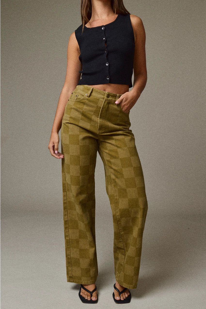 Make a bold statement in these on-trend wide leg jeans. Featuring an eye-catching checkered print, they combine retro vibes with modern style. The relaxed fit and high-rise waist create a flattering silhouette that pairs effortlessly with everything from graphic tees to cropped sweaters. Perfect for standing out while staying comfortable, these jeans are a must-have for fashion lovers who aren’t afraid to play with pattern.