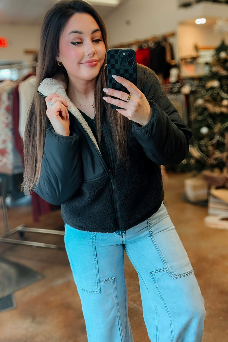 Reversible design: sherpa one side, smooth puffer the other