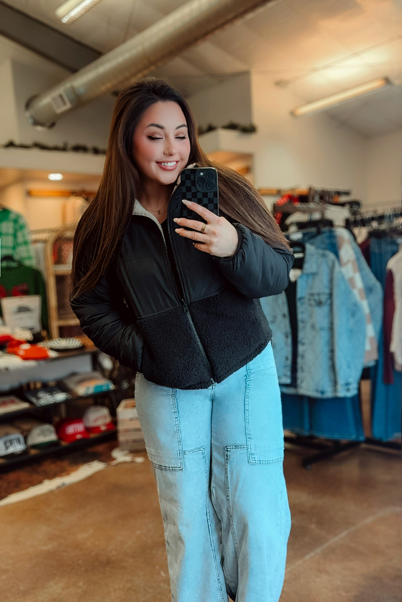 Two looks, one cozy jacket. This Reversible Sherpa Block Puffer is your go-to for warmth, comfort, and effortless style. One side features soft, plush sherpa for ultimate coziness, while the other sports a sleek puffer finish for a sporty-chic vibe. Oversized block design and a relaxed fit make layering easy, and the reversible feature gives you double the styling options for any chilly day.