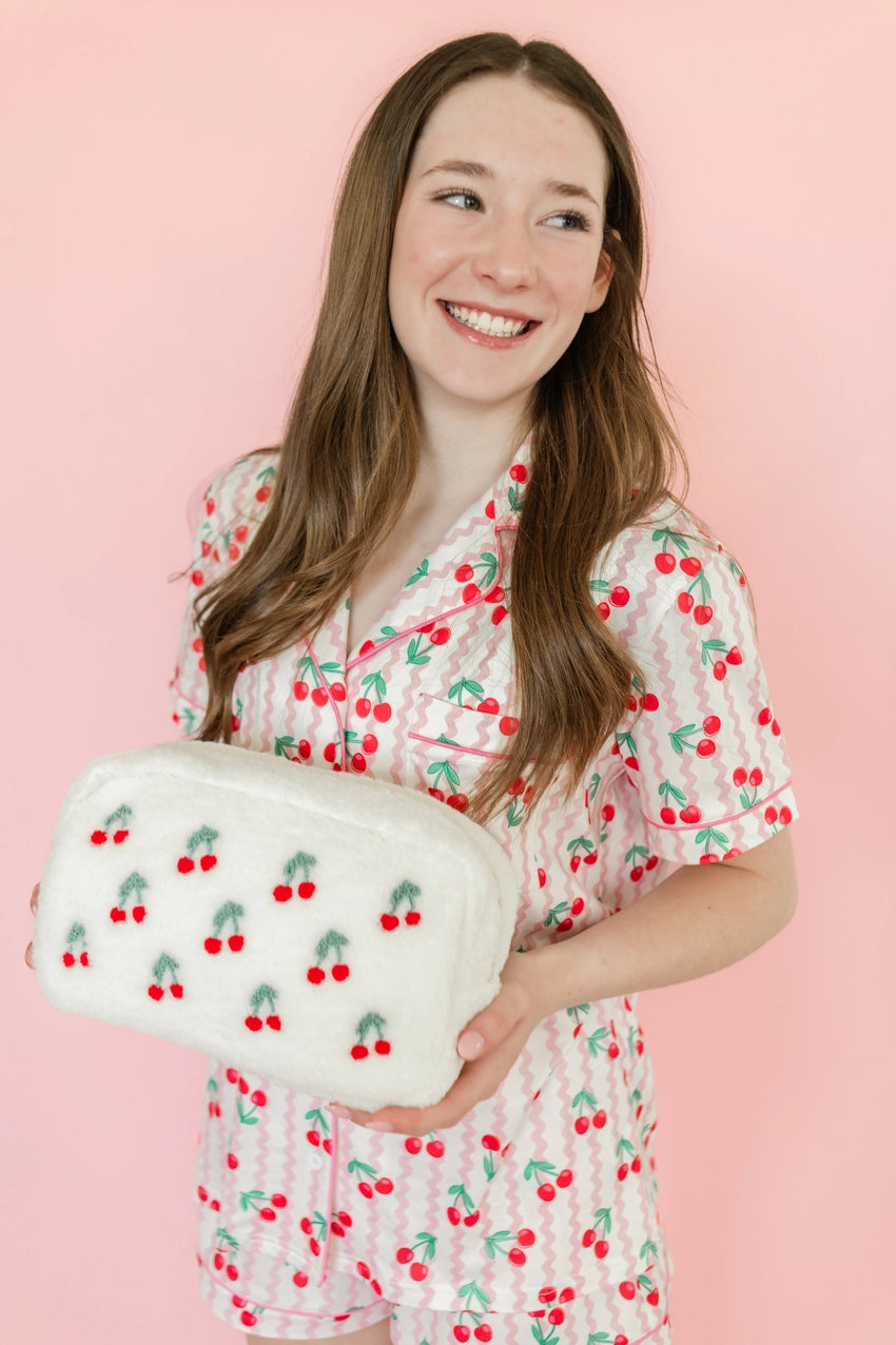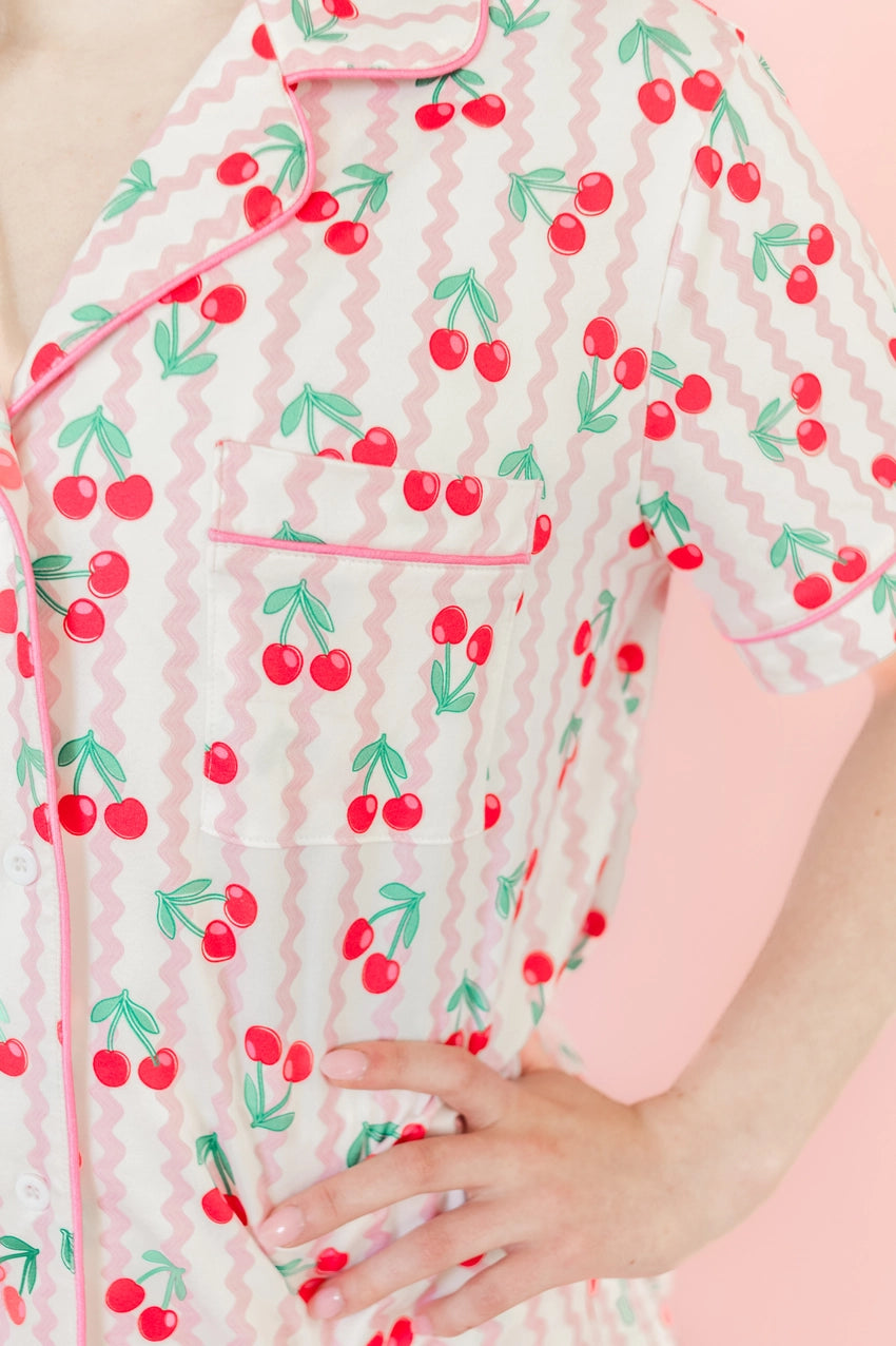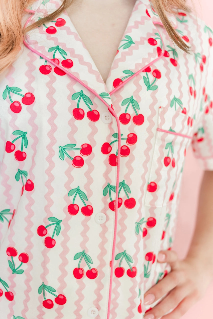 The Cherry On Top Ric Rac Pajama Set is the perfect blend of sweet and sassy. Featuring an all-over cherry print with charming ric rac trim, this ultra-soft set is made for cozy nights and cute mornings. Lightweight, breathable fabric keeps you comfy year-round—because your sleepwear should be as fun as your daytime wardrobe.