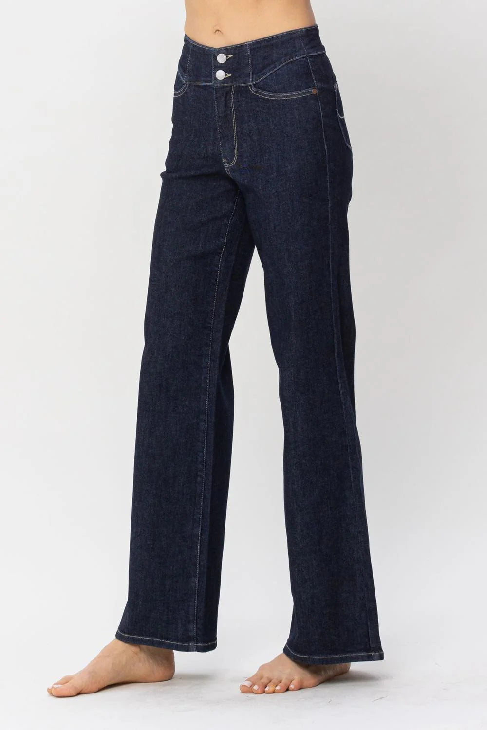 Step up your denim game with these effortlessly chic Judy Blue wide-leg jeans. Featuring a rich rinse wash and intricate geometric embroidery along the pockets, they blend everyday comfort with eye-catching detail. The high-rise fit flatters your shape while Judy Blue’s signature stretch denim keeps things comfy all day long. Pair them with a simple tee or a tucked-in blouse for a polished, boho-inspired look that works from day to night.