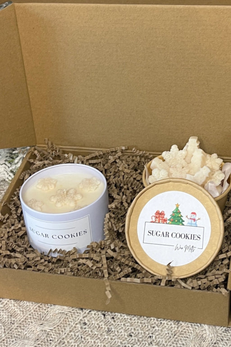Ring in the Holidays with our Sugar Cookies candle + wax melts gift set! This collection includes one 4oz candle and 2oz wax melts inside a cozy festive winter themed gift box. Enjoy a warm mouth-watering aroma of fresh baked sugar cookies with our Sugar Cookies fragrance! Top and middle notes of milk, buttery dairy & sugar cookie bakery followed with vanilla and spices this fragrance feels like a hug from Grandma! Our candles and melts are made with an all natural soy wax, high end non-toxic fragrance oils & hand poured in small batches.