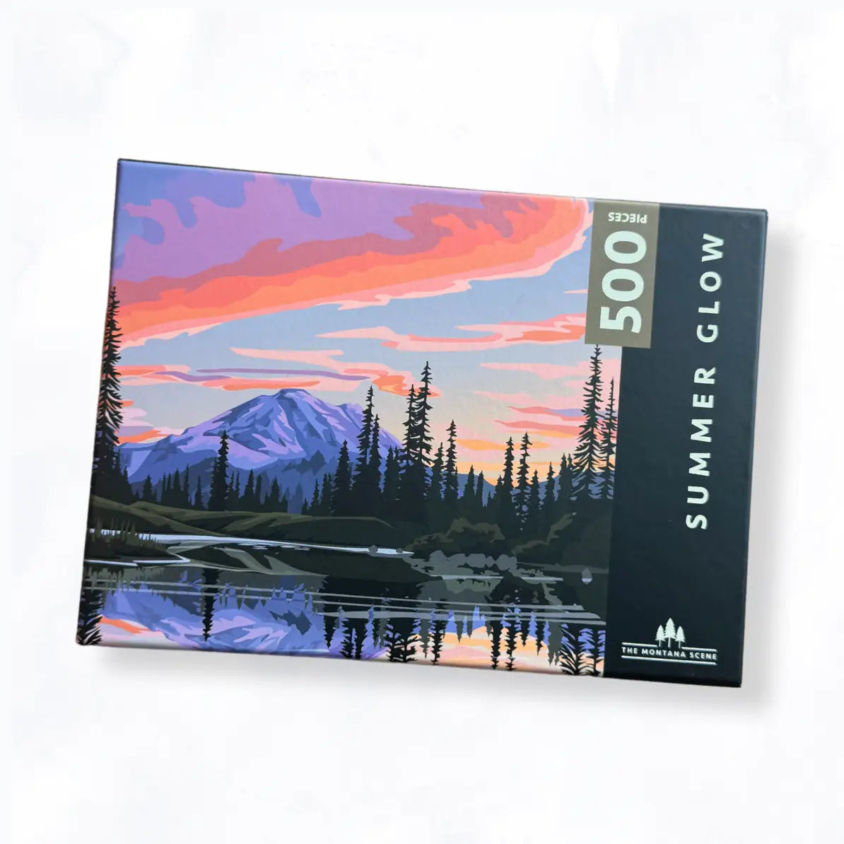 Indulge in the mesmerizing hues of a summer evening with our 'Summer Glow' puzzle. As the sun bids farewell, it paints the sky in delicate shades of pinks and purples, casting a dreamy ambiance over the tranquil mountain lake below. With serene waters and vibrant wildflowers adding a touch of enchantment to the scene.