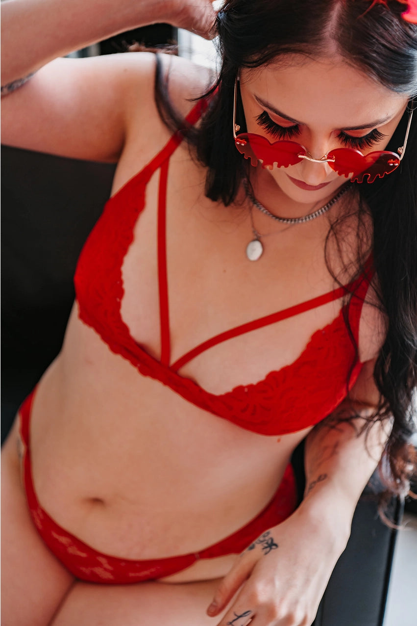 Say hello to this spicy little red number- This bralette features a plunging neckline with detailed chest straps. With asymmetrical lace along the chest bands, adjustable straps, and triple hook closure, this style is guaranteed to fit you as needed. Don't forget the limited matching briefs!