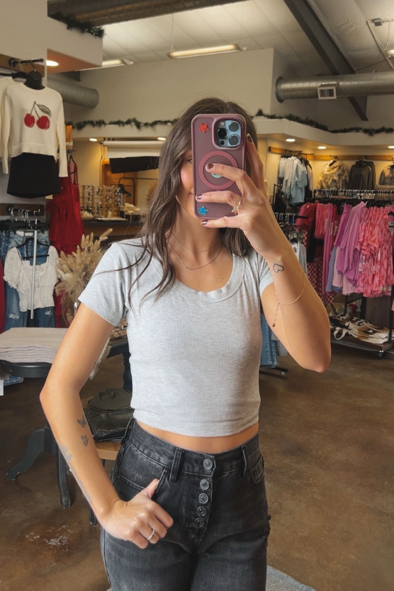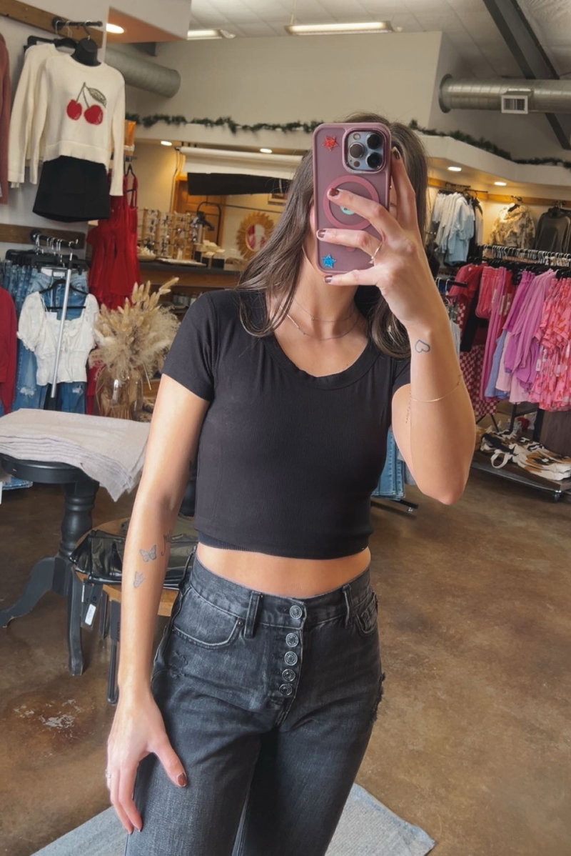 A modern essential with endless styling potential. The Ribbed Scoop Neck Crop Short Sleeve Top features a flattering scoop neckline and a soft ribbed texture that hugs just right. Designed with a cropped length and comfortable stretch, this top pairs perfectly with high-rise denim, skirts, or layered looks for an effortlessly cool outfit.