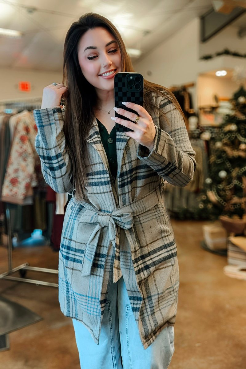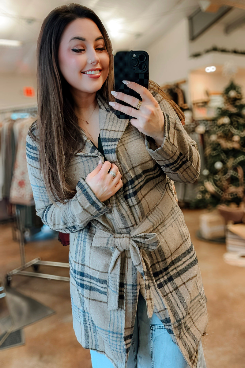 Classic plaid meets modern structure in this effortlessly polished jacket. Designed with a sharp notched collar and long sleeves, it delivers that timeless tailored look while still feeling cozy and wearable. The adjustable waist belt cinches perfectly to define your shape, giving you the option of a relaxed or more refined silhouette. With its soft feel and clean lines, this plaid jacket adds instant sophistication to any outfit—pair it with denim, trousers, or boots for an elevated fall-to-winter look.