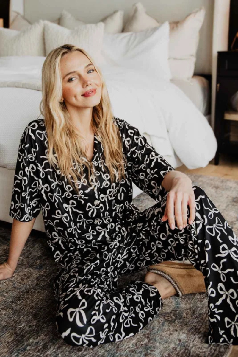 Drift into the coziest night’s sleep with our Midnight Bow Dreams PJ Set. This charming two-piece features a soft black base adorned with delicate bow prints for a touch of sweet femininity. The relaxed-fit pants and matching top keep things comfy without sacrificing style, making it perfect for lounging, movie nights, or slow Sunday mornings. Lightweight, breathable, and irresistibly cute—your new favorite pajamas have officially arrived.