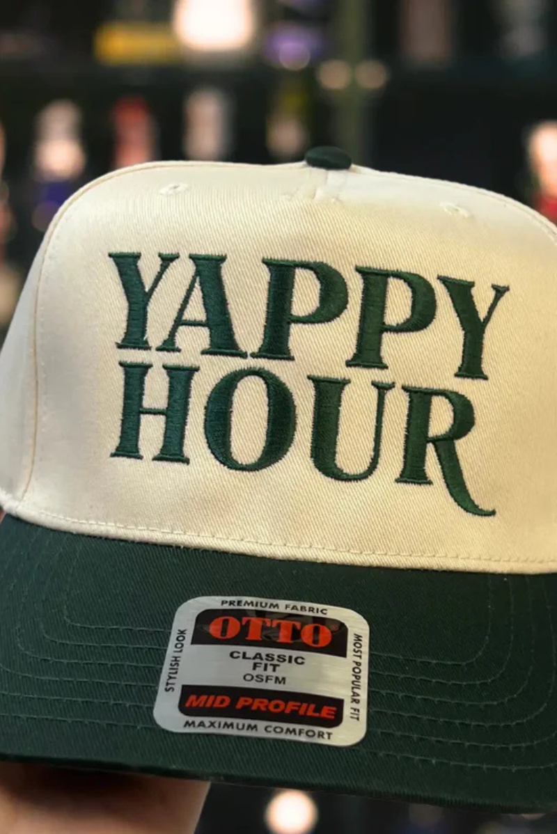 Introducing the Yappy Hour Embroidered Trucker Hat, the hat brand is Otto Cap! Elevate your style with this vintage trucker hat that has an adjustable snapback, perfect for any yappy hour occasion.